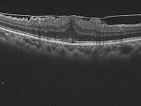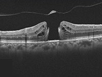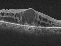 黄斑とは、網膜の中心に位置し、視力の根源ともいえる組織です。黄斑前膜とは黄斑部の網膜の手前にセロファン状の膜を形成する病気です。はじめは自覚症状に乏しいのですが進行し、膜が厚くなると視力が低下し、また、膜が収 縮すると、歪みを自覚します。原因は解明されていませんが、加齢による硝子体という眼の中のゼリー状の物体が液体化し、そのことが原因で膜がはってくると考えられています。他に、炎症や強度近視眼、糖尿病網膜症、外傷や網膜剥離術後にも同様の膜形成をきたします。黄斑上膜の形態には個人差があり、みえにくさや視力の低下もひとそれぞれです。網膜の層構造が著しく乱れたり、黄斑部に偽円孔という、くぼみをきたすこともあります。