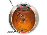 VEGFの働きを抑える「抗VEGF薬」を眼球内に注射して治療を行います。加齢黄斑変性症に対してはルセンティス・アイリーアが認可されています。硝子体注射は、点眼麻酔を行い、顕微鏡下にて抗VEGF薬を眼内に注入します。非常に細い針を用いますので、痛みはほとんどありません。当日は眼帯をせずに帰宅可能です。感染予防目的で前後に抗菌剤の点眼をしていただきます。十分に効果を発揮させるためには、注射を連続して受ける必要があります。通常は初回3か月間毎月注射し、その後は状態に応じて継続する、もしくは、投与間隔を延長してゆきます。加齢黄斑変性は、治療後の再発が多いため硝子体注射は長期間にわたって必要になることが多く、根気よく治療を受ける必要があります。