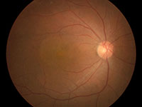 網膜の中心、すなわち黄斑部の後ろに水がたまる病気です。40歳代から50歳代にかけての働き盛りの男性に多い病気です。症状は中心がみづらい、中心の色が変わってみえる、歪んでみえる、などです。多くは自然に治り、3か月程の経過で視力も回復します。しかし、中心の見えにくさは残ります。しかし、長期間放置すると、視力低下が進み、回復困難になります。この場合は液が漏れている場所をレーザーで凝固する方法があります。通常のレーザーでは中心に見えにくい点(暗点)が残りますが、当院の大越医師は侵襲が少なく、暗点の出ない閾値下凝固を日本で初めて導入し、この疾患に対し、200例を超える多数の患者様の治療を行ってまいりました。漏出点(水漏れの箇所)が中心窩(網膜のものを見る一番中心)に近く、従来のレーザーでは治療が困難な患者様でも治療が可能です。また漏出点が明瞭でない症例や、パキコロイド新生血管といって中心窩下に新生血管を伴う方の治療も行っております。他院で治療が出来なかった方や、再発を繰り返している方は、お気軽のご相談下さい。この病気はストレスが原因と言われております。気晴らしをしたり、リラクセーションが必要です。
