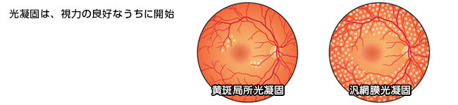 糖尿病網膜症は早期発見ができれば、有効な治療を受けることが可能です。視機能の回復は難しいといわれますが、将来の失明予防のために重要な治療法です。糖尿病と診断されたことのある方、高血糖を健診で指摘された方は、定期的に眼科にて検査を受け、早期発見・早期治療をされることをおすすめいたします。