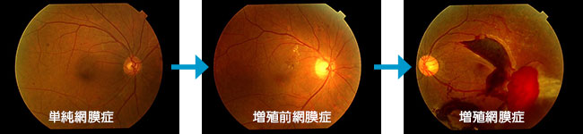 | 網膜症ステージ | 網膜症なし | 単純網膜症 | 増殖前網膜症 | 増殖網膜症 |